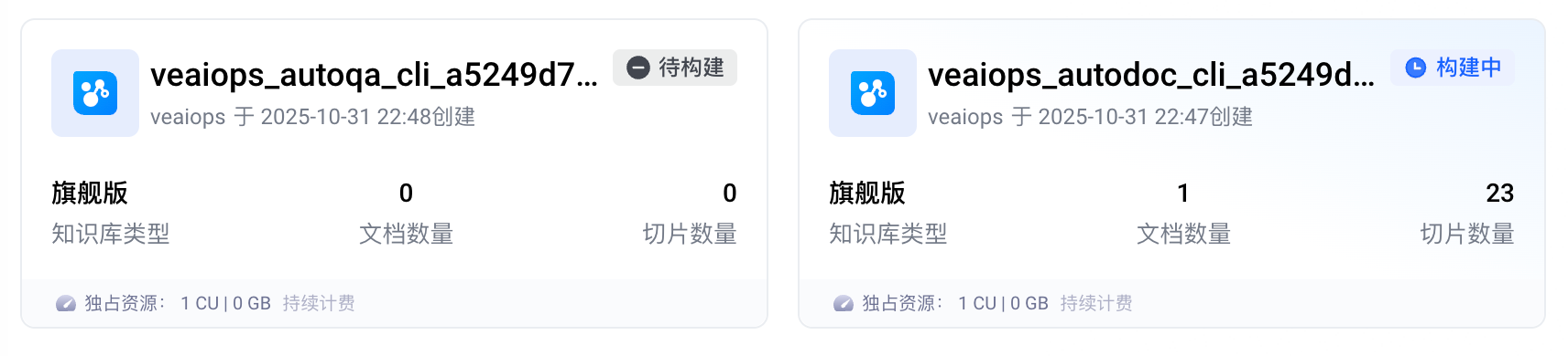 默认创建的两个知识库如图所示,您可以在火山知识库管理界面查看和管理这些知识库。